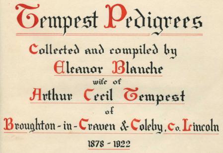 I am very grateful to John Schuerman for the opportunity to make available here a digitized version of the transcript of the manuscript Tempest Pedigrees, compiled by Eleanor Blanche Tempest (1853-1928), a monumental work tracing the genealogy of the Tempest families of Yorkshire, Lincolnshire and other counties. This is presented in Word format in a sequence of files, some of which are quite large.