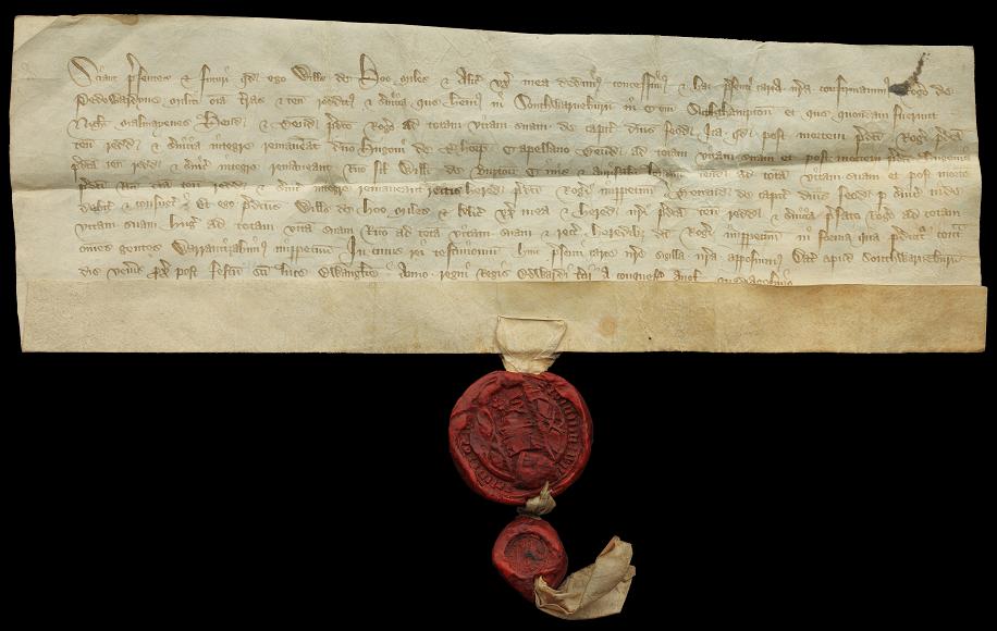 Charter of William de Hoo, knight, and Alice, his wife, granting to Roger de Pedewardyne, knight, their lands and tenements in South Warnborough in the county of Hampshire, which were formerly of Nicholas Malmayenes. The lands were to be held successively for their lives by Roger, by Hugh de Thorp, chaplain, and by Richard, son of William de Burton, citizen and goldsmith of London, and then to remain to the right heirs of Roger. South Warnborough, 23 October 1366.