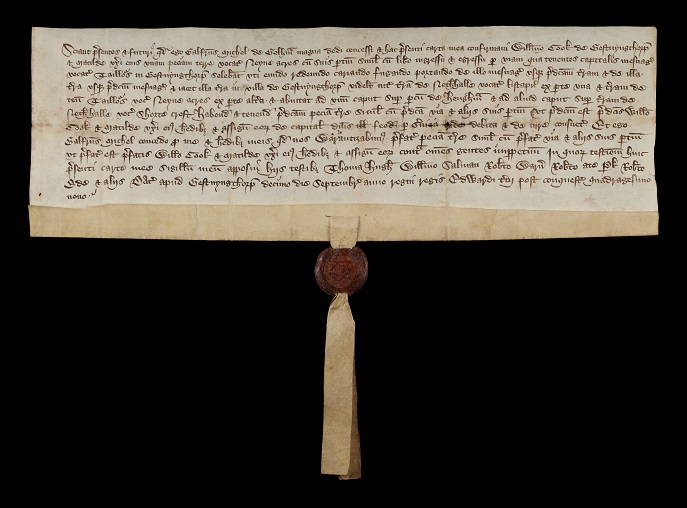 I Geoffrey Michel of Gelham magna have granted to William Cook of Gestnyngthorp and Maud, his wife, one piece of land called Neyne acres, together with free ingress and egress by the way which the tenants of the capital messuage called Taillo[ur]s in Gestnyngthorp were accustomed to use. The land lies in the vill of Gestnyngthorp between the land of Neth[er]halle called Listapil on one side and the land of the tenement Taillo[ur]s called Neyne acres on the other and abuts at one head on the park of Hengh[a]m and at the other head on the land of Neth[er]halle called Shorte Croft. To hold to William Cook and Maud, his wife, their heirs and assigns, of the chief lords of the fee. I grant for me and my heirs that we will warrant against all men for ever. In witness whereof I have set my seal. Witnesses: Thomas Hugh, William Salman, Robert Warn[er], Robert ate P[ar]k, Robert Ede and others. Given at Gestnyngthorp 10 September, 49 Edward III [1375].