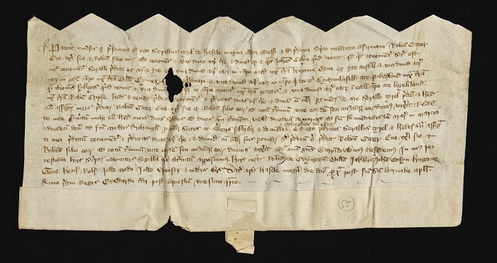 Serallus Tyrel of Hasele Magna [Great Haseley, Oxfordshire] has conveyed, granted and confirmed to Robert Gater, Eve, his wife, and Robert, their son, a tenement and 2 acres of land and a half which John Colyn formerly held, which tenement is situated between the tenements of Serallus on each side and 1 half acre lying in the west field by the land of Hugh Geue [or Gene] on the south side and 1 half acre lying in the same field by the land of William Eymer [on] the north [side] and 1 half acre lying in the field which is called Wyndmilnfeld' at Pikedlond' by the land which Thomas Sykeys formerly held and 1 half acre lying in the east field by the land of the rector and 1 half acre lying in the same field at Boyelilond' by the land of Robert Cripse.